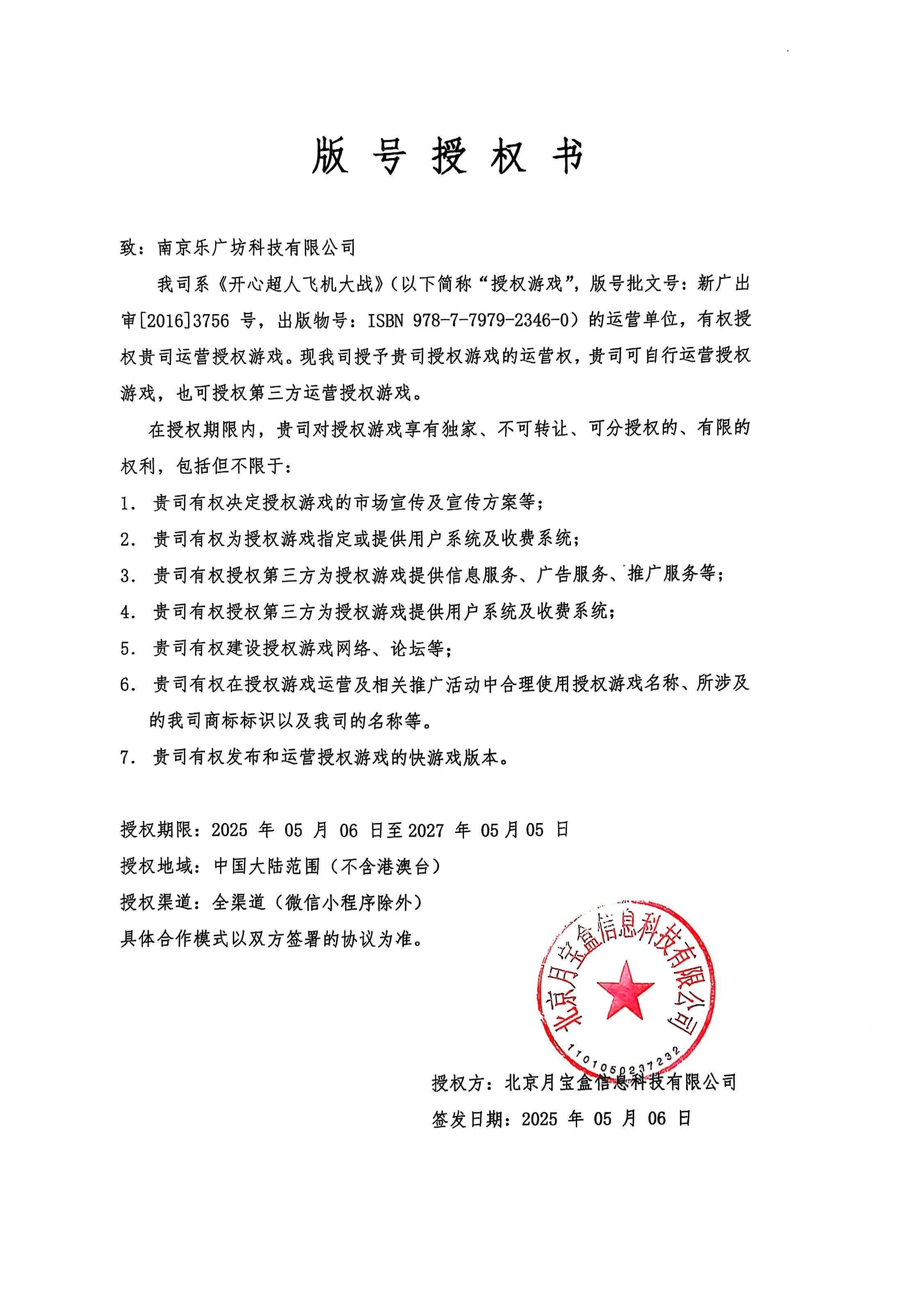 《开心超人飞机大战》[简称:开心超人飞机大战]以下简称“授权游戏”软件著作权登记号:2015SR072110)是苏州美生元信息科技有限公司自主研发,北京月宝盒信息科技有限公司经合法获得游戏版号的移动网络游戏产品,对授权游戏拥有合法权利。现苏州美生元信息科技有限公司和北京月宝盒信息科技有限公司都以独占许可的方式授予南京乐广坊科技有限公司授权游戏的运营权,南京乐广坊科技有限公司可自行运营授权游戏也可授权第三方运营授权游戏。 查看游戏版权授权书 查看游戏版号授权书